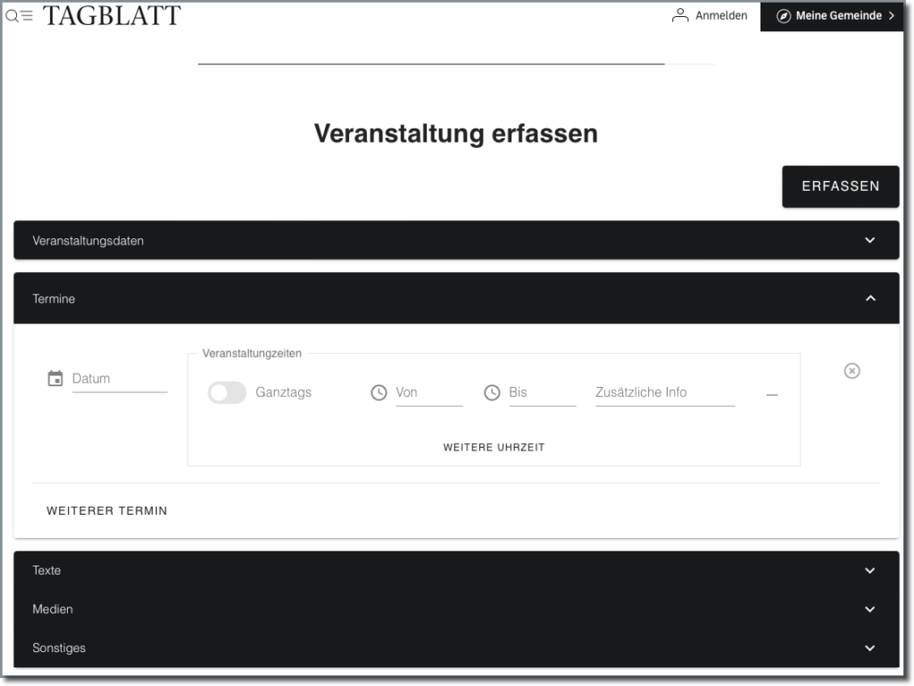 Veranstaltungen, Artikel oder Werbung ganz einfach im Online-Client erfassen
